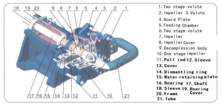 1. The pump adopts a semi-open impeller with wide flow passage and good throughput. There is no blockage when conveying slurry containing particles, and the particles will not be stuck between the impeller and the pump body and the pump cover.